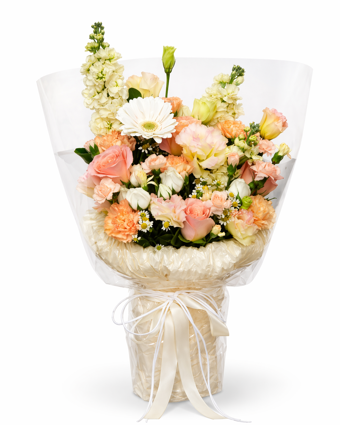 The “Serene Blossoms” bouquet is a perfect reflection of the gentle, nurturing love that mothers provide. Featuring a delicate blend of soft peach and white carnations, elegant roses, and cheerful daisies, this bouquet radiates tranquility and affection. The creamy white wrapping and satin ribbon create a peaceful, refined look, while the light pastel tones symbolize warmth, tenderness, and admiration. A beautiful Mother’s Day gift, “Serene Blossoms” is a thoughtful way to express your deepest love and appreciation for the special woman who brightens your world every day.