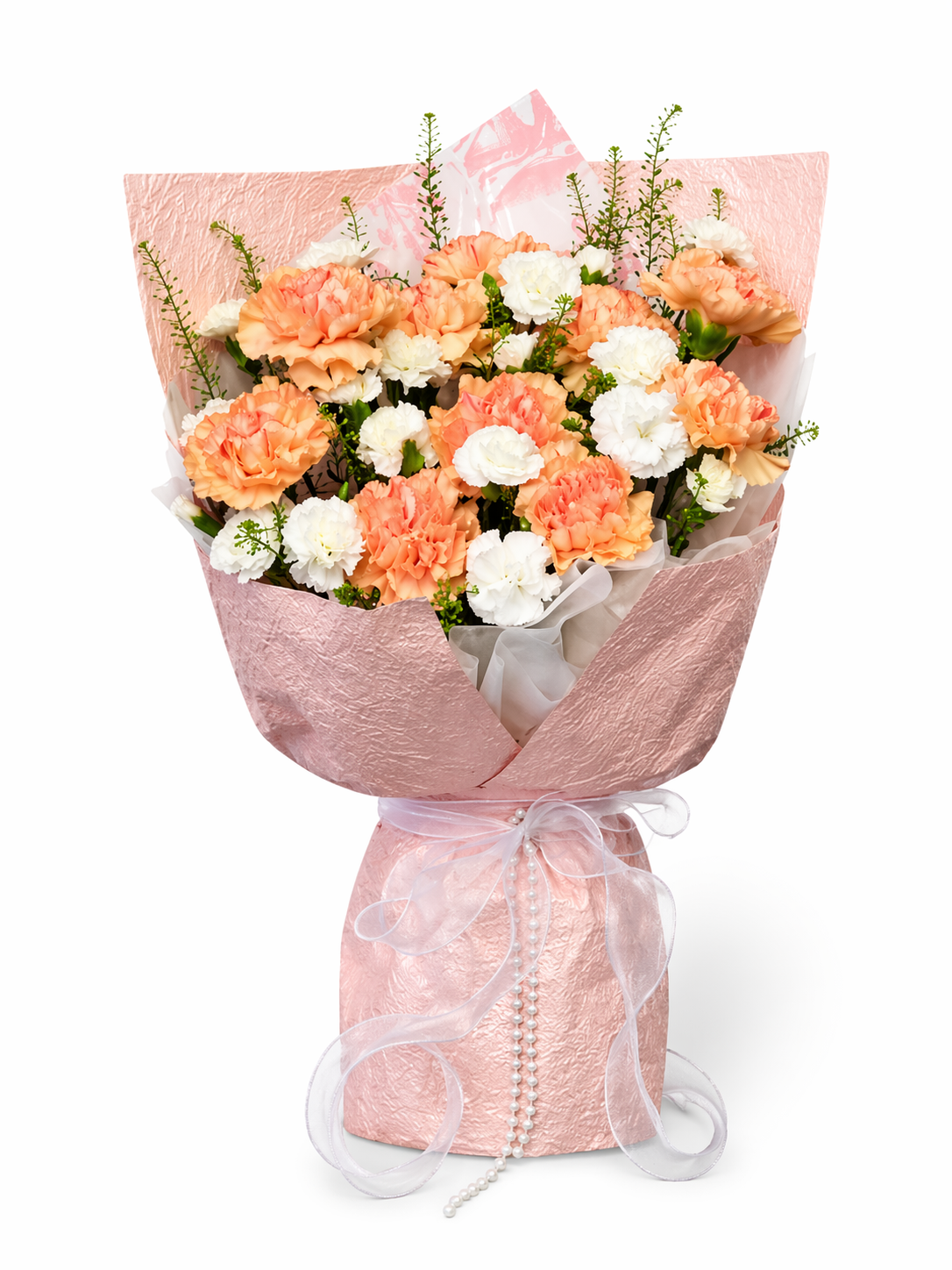 The “Blossom Delight” bouquet is a soft, elegant tribute to the nurturing love of a mother. Featuring a delicate mix of peach carnations and white carnations, this bouquet symbolizes purity, love, and admiration. The subtle beauty of the peach tones is complemented by soft green filler and delicate greenery, creating a balanced, graceful arrangement. Wrapped in textured peach paper and finished with a satin ribbon adorned with pearls, this bouquet is a perfect way to express your appreciation and love this Mother’s Day, making every moment spent with her even more special.