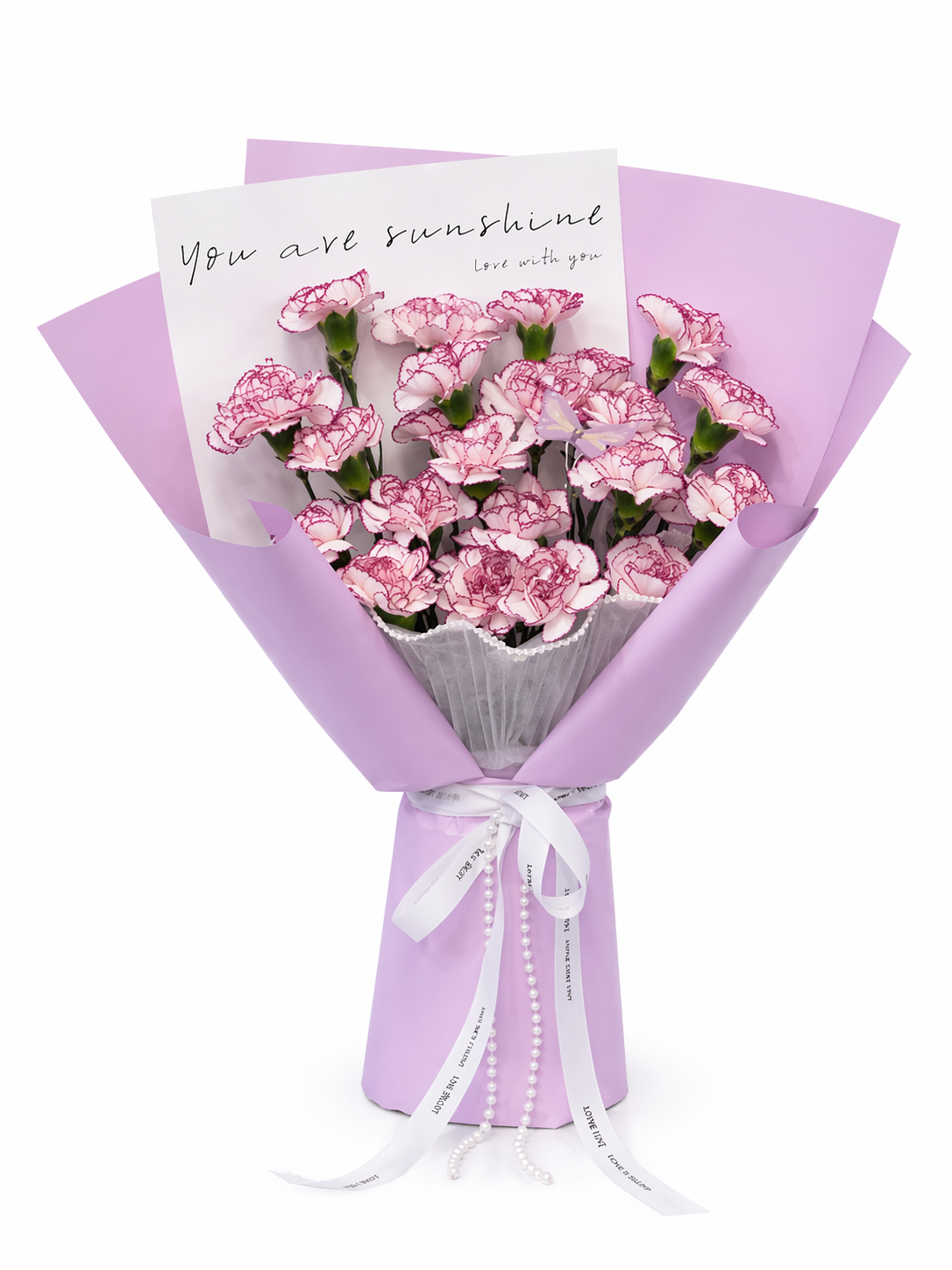 The “Radiant Love” bouquet is a perfect tribute to the glowing light mothers bring into our lives. With its soft pink carnations delicately arranged and accented by the thoughtful note “You are sunshine,” this bouquet conveys the warmth, love, and joy that mothers radiate every day. Wrapped in soft lilac paper and tied with a satin ribbon adorned with pearls, it’s a stunning gift that will make this Mother’s Day unforgettable. Let this bouquet remind her of the beauty she brings to your world—just like sunshine lighting up the day.