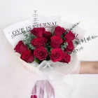 Gorgeous bouquet design with red roses & gold artificial leaves.