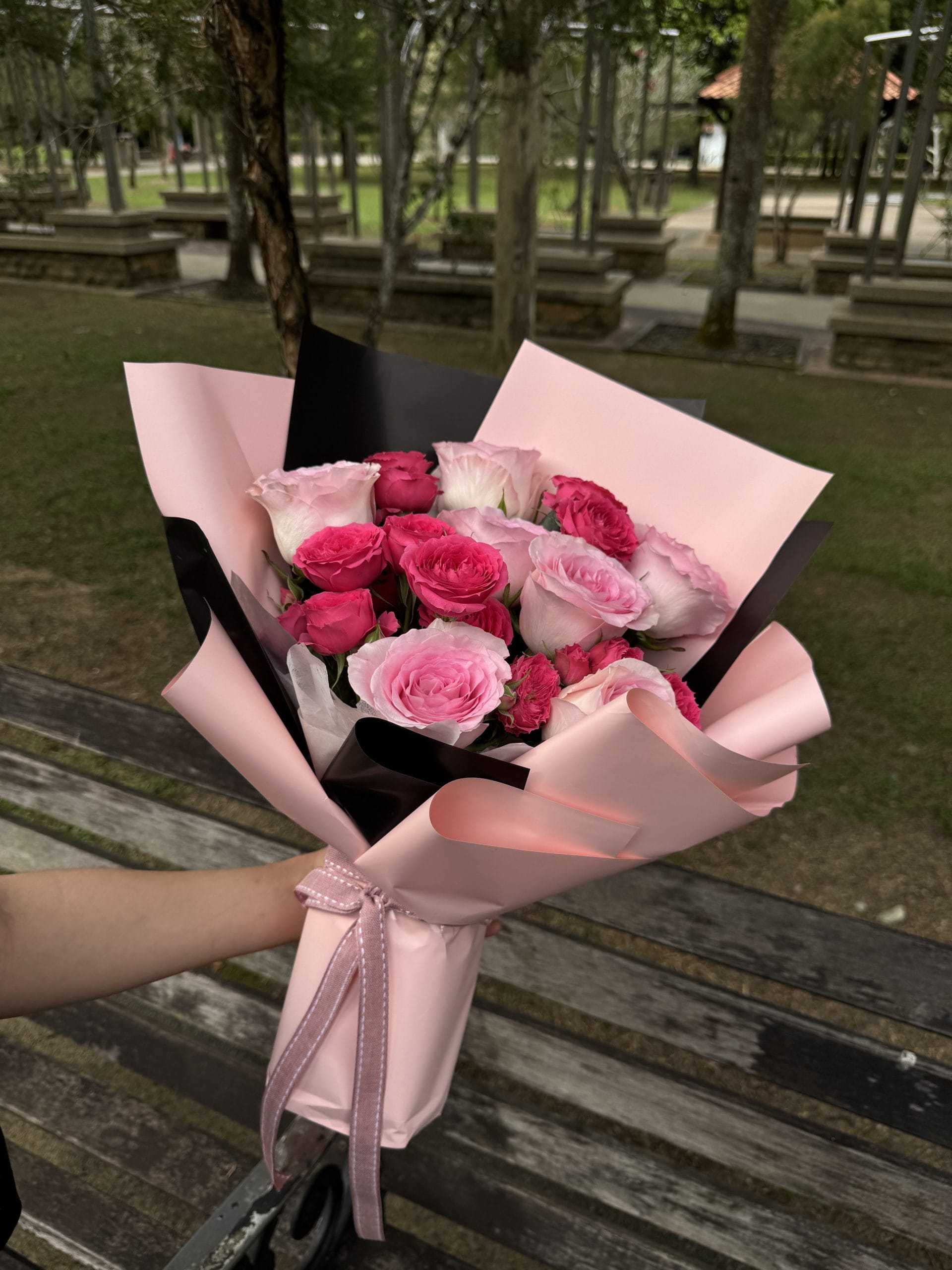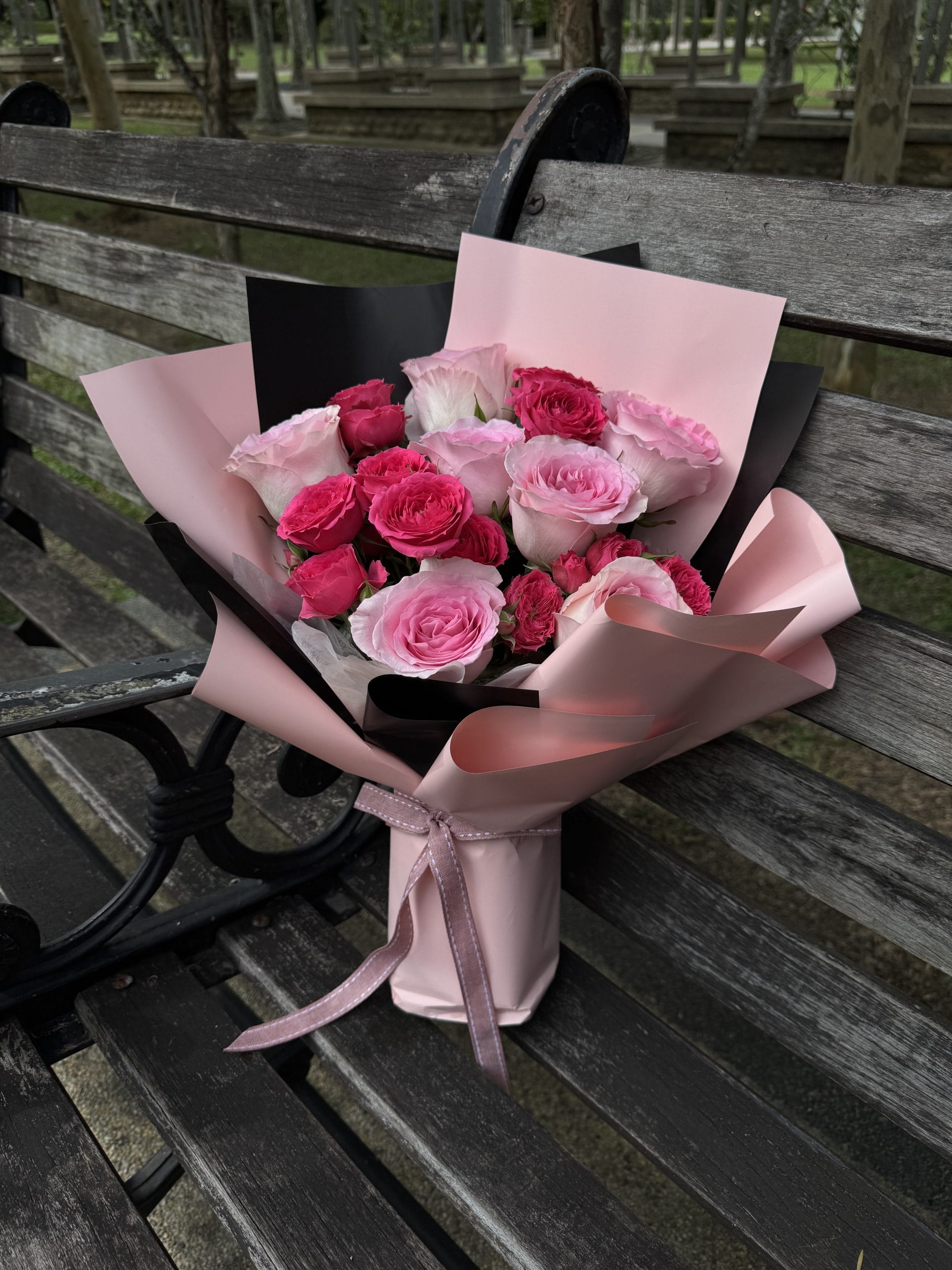 A breathtaking blend of romance and elegance, the Twilight Roses bouquet captures the beauty of love in every delicate petal. Featuring stunning dark jelly pink rose sprays intertwined with roselle roses, this arrangement is a symphony of rich hues and soft textures. Wrapped in sophisticated pink and black tones, it exudes both charm and mystery, making it the perfect gift for someone who deserves something truly special. Whether it’s for Valentine’s Day, an anniversary, or just because, Twilight Roses is a bouquet that speaks the language of love with grace and passion.