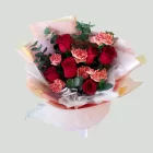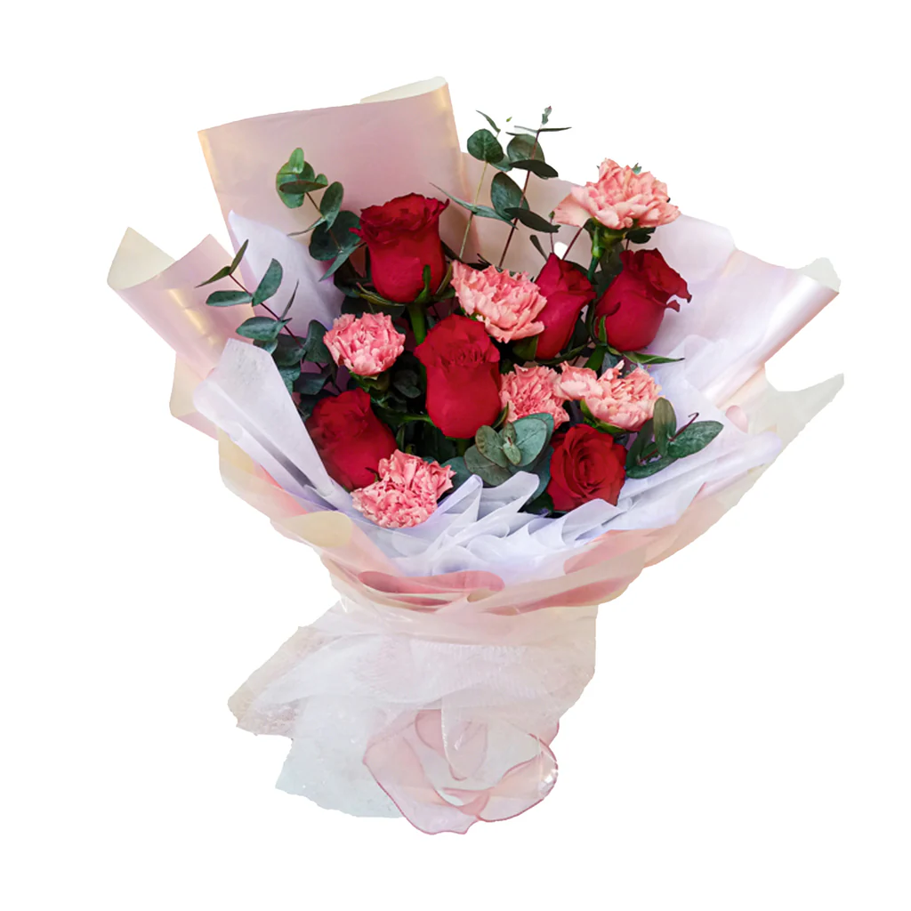 Gorgeous bouquet design with red roses, pink carnation & Eucalyptus leaves.