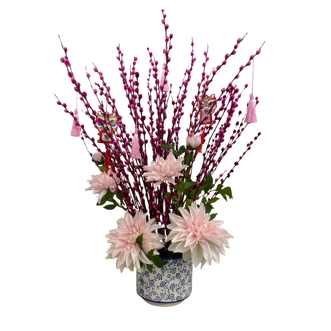Soft pink pussy willow branches rise gracefully above lush blush dahlias, symbolizing tenderness, happiness, and blossoming opportunities. A refined and uplifting arrangement perfect for homes seeking calm prosperity and joy.