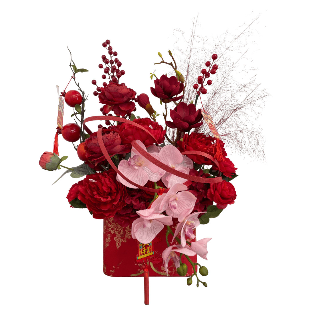 Deep red florals and lotus-style blooms rise above lucky berries and airy branches, while delicate pink orchids spill gracefully over the edge—symbolizing prosperity, beauty, and new beginnings.